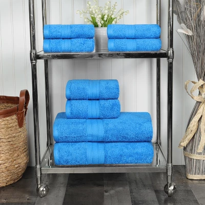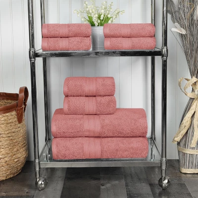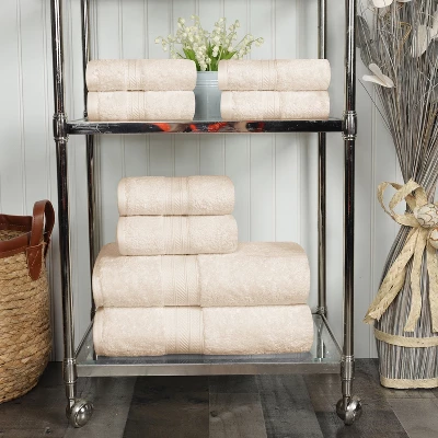 Incredibly soft and quick-drying, the Rivendale Cotton Solid Assorted 8-Piece Towel Set is just what you need to bring the spa-vibe home. This premium Long Staple Combed Cotton construction boasts a heavy towel weight, making each towel thick and highly absorbent to keep you warm and get you dry quickly. These ultra-plush and fluffy towels will soak up moisture effortlessly, keeping you toasty warm as soon as you step out of the shower or bath. Available in a range of color options to easily mix and match with your existing bathroom décor, each towel in this bundle features a decorative dobby border for modern style.