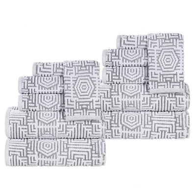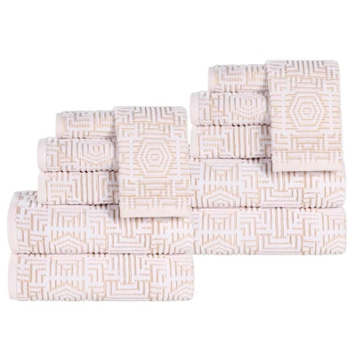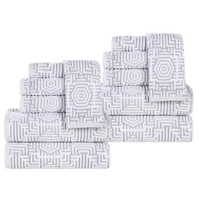 Give your master and guest bathroom the dream makeover with the Cotton Modern Geometric Jacquard 550 GSM 12 Piece Bathroom Towel Set by Blue Nile Mills. Our medium weight cotton towels provide comfort, durability, and versatile absorption, perfect for the shower, bath, or beach. These plush and fluffy towels will sop up moisture effortlessly, keeping you warm and dry. Featuring a geometric jacquard design, these elegant towels are available in gold, blue, platinum, and charcoal color options to seamlessly match your bathroom style. This bathroom towel set includes; 4 face towels, 4 hand towels, and 4 bath towels.