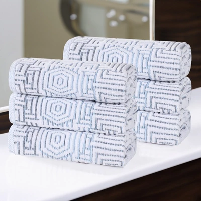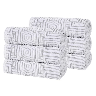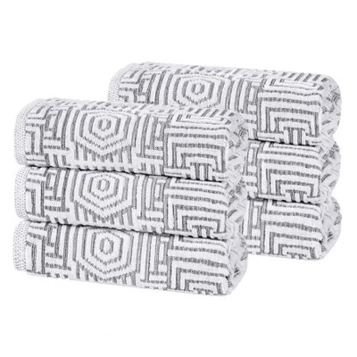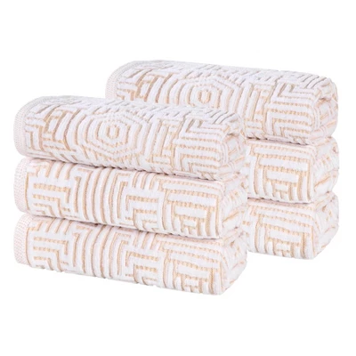 Turn washing your hands into a luxury experience with the Cotton Modern Geometric Jacquard 550 GSM Hand Towel Set of 6 by Blue Nile Mills. Our medium weight cotton towels provide comfort, durability, and versatile absorption, perfect for cleaning up spills or to effortlessly dry your hands off. These plush and fluffy towels sop up moisture to help get you dry quickly. Featuring a geometric jacquard design, these elegant towels are available in gold, blue, platinum, and charcoal color options to seamlessly match your home decor style. This set of daily essentials includes 6 hand towels to easily stock your bathroom or kitchen.