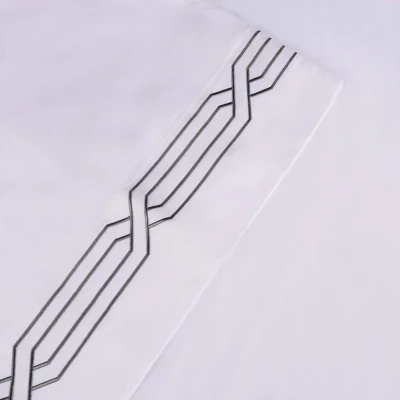 Instantly add elegance and irresistible texture to your bedroom with the Cotton Embroidered Geometric Scroll Sheet Set by Blue Nile Mills. Crafted from our most luxurious Cotton, this 1200 thread count sheet set is breathable, ultra-soft, and perfect for every day use. Each flat sheet and pillow case features a geometric scroll embroidered hem and luminous sheen from the sateen weave for a polished look. The deep pocket fitted sheet fits mattresses 15-18 inches thick. Available in a solid white color with contrasting embroidery colors, including; charcoal, navy blue, taupe, or white, easily refresh the look of your bedroom with this bedding set.